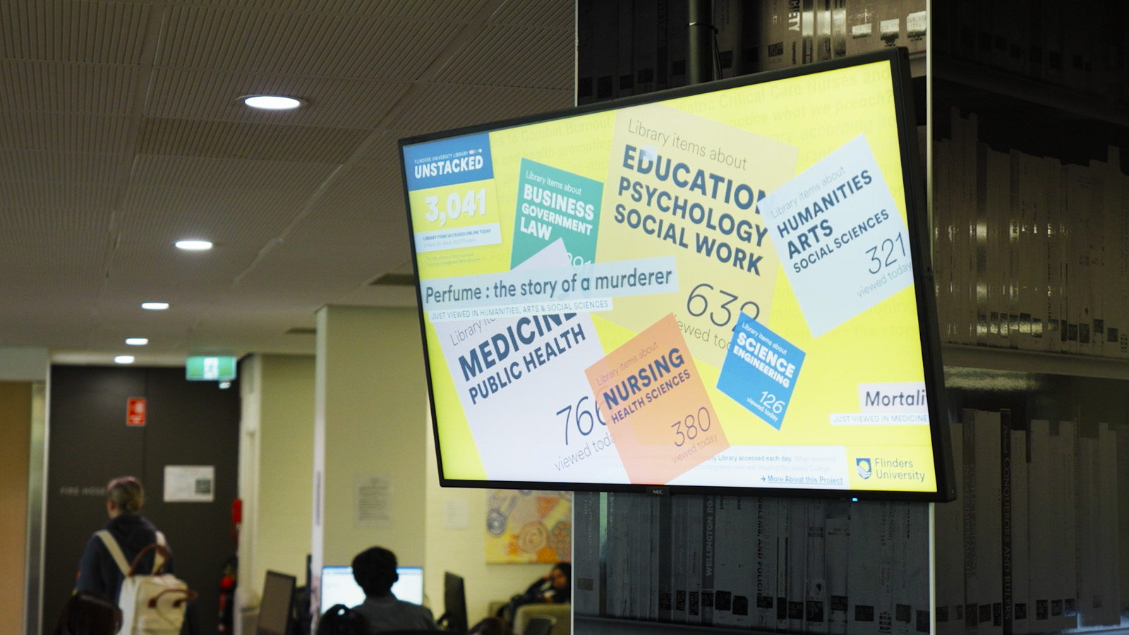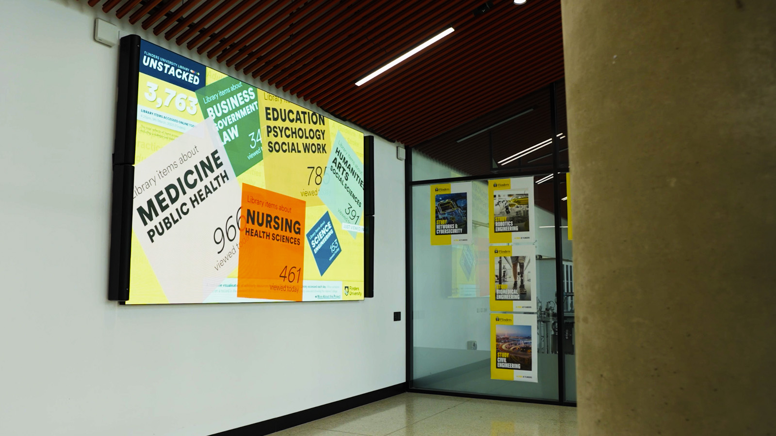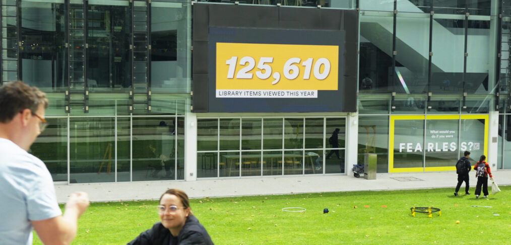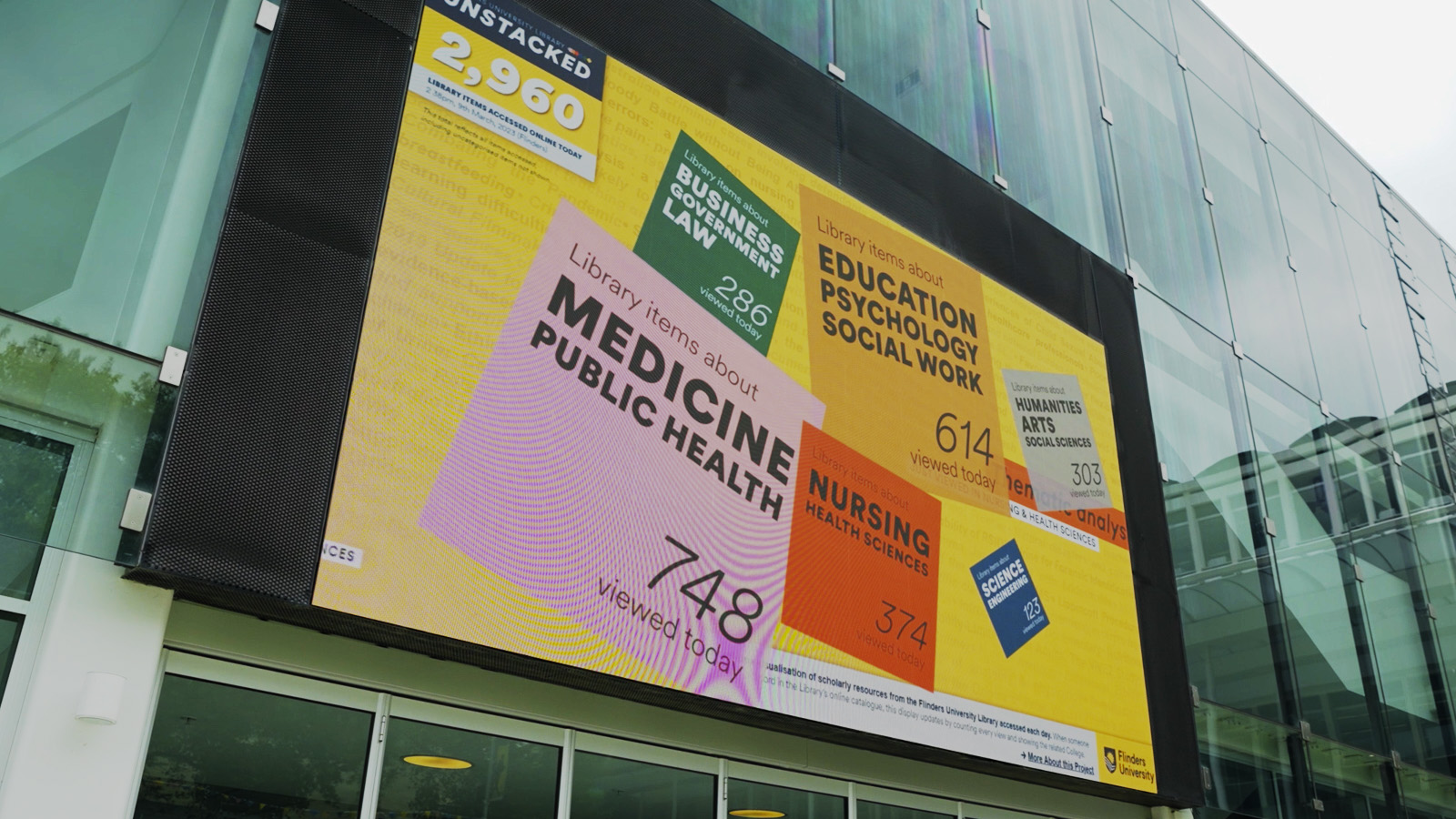 Whenever someone views an item on the online catalogue — whether a journal article, book, video or other resource — the interaction is represented by a coloured tile that flies in and lands on the relevant Study Area. A live count of catalogue interactions is displayed by Study Area, along with the total number of items viewed throughout the day. Together, these patterns reveal the dynamic relationship between the Library and research at individual, study area and university levels.