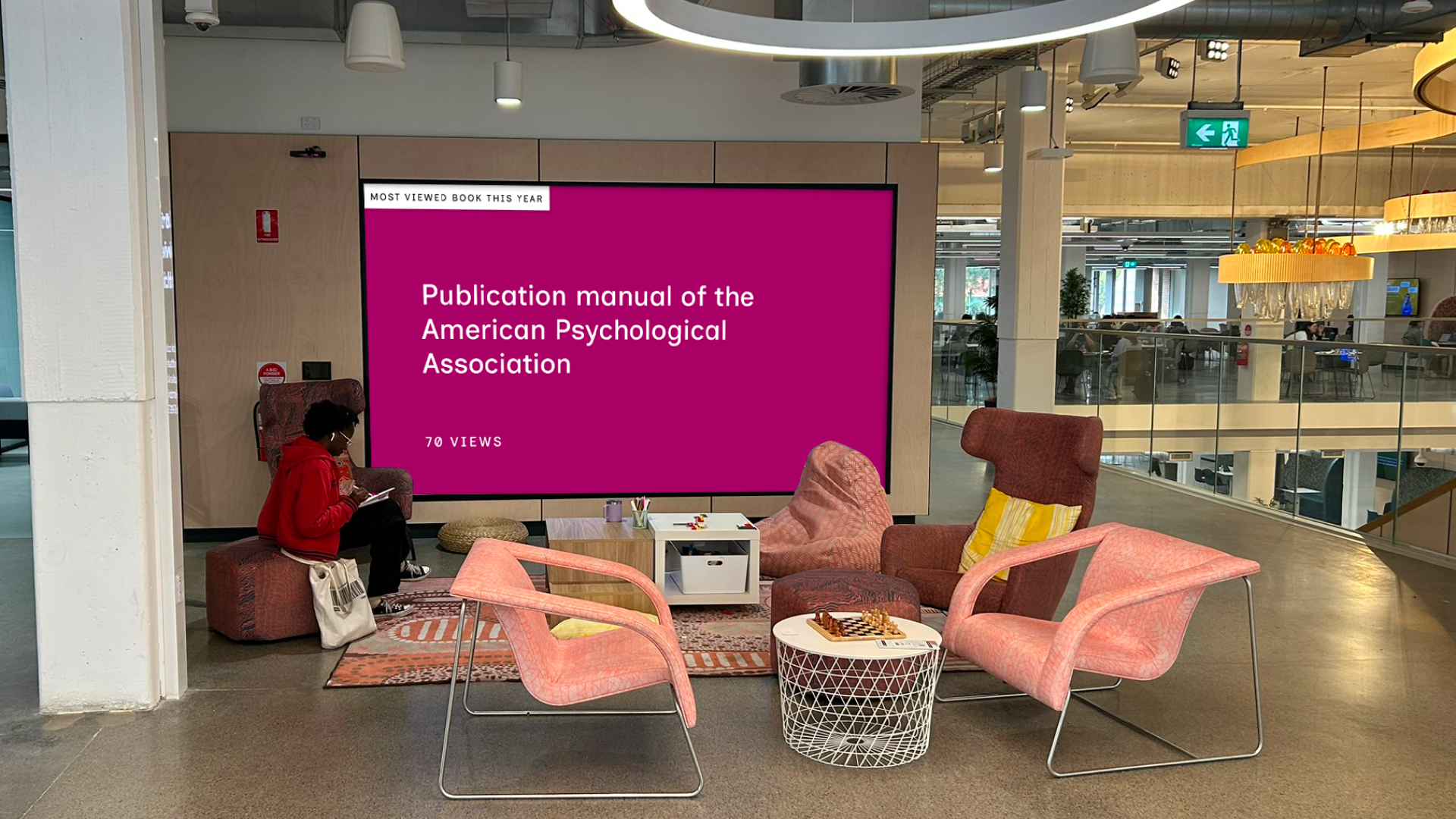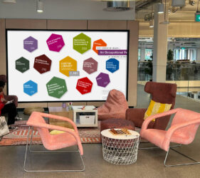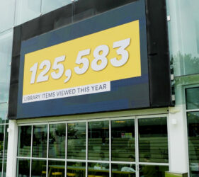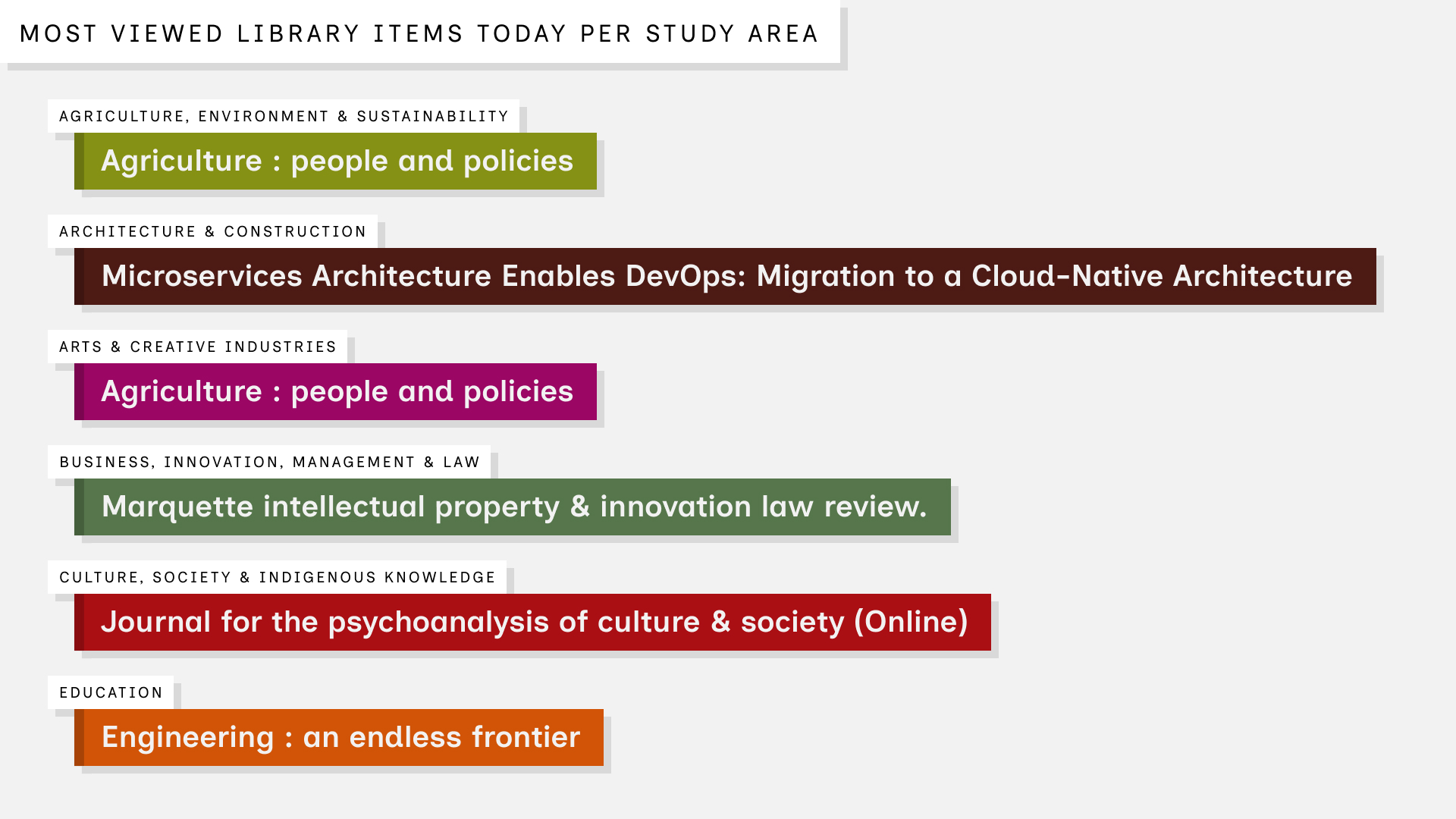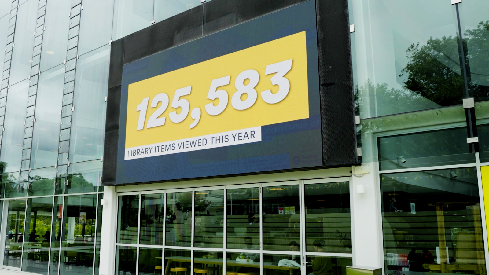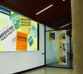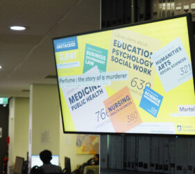 Whenever someone views an item on the online catalogue — whether a journal article, book, video or other resource — the interaction is represented by a coloured tile that flies in and lands on the relevant Study Area. A live count of catalogue interactions is displayed by Study Area, along with the total number of items viewed throughout the day. Together, these patterns reveal the dynamic relationship between the Library and research at individual, study area and university levels.