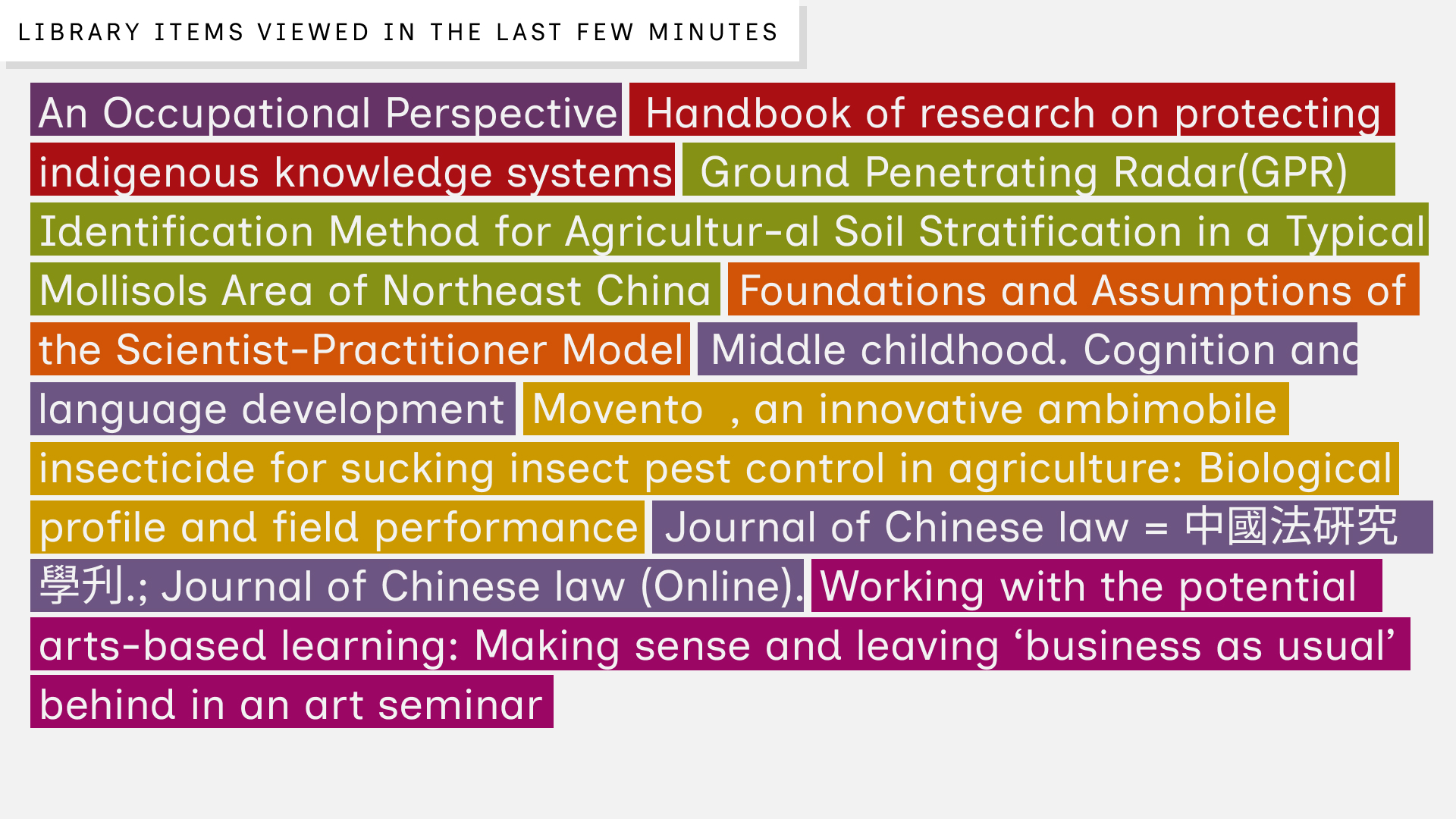 This real-time visualisation tells the story of how the University’s community is using the Library’s collection as it happens.